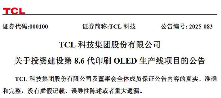 TCL科技集团股份有限公司发布公告称,TCL科技、子公司TCL华星与广州市人民政府、广州经济技术开发区管理委员会共同签署项目合作协议,拟共同建设一条月加工2290mm×2620mm玻璃基板能力约2.25万片的第8.6代印刷OLED显示面板生产线项目”或“本项目”),主要产品涵盖平板、笔记本电脑、显示器等应用领域。