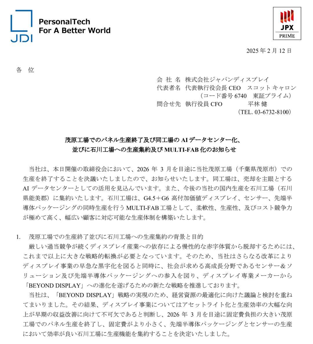 2月12日,JDI正式宣布一项重大战略决策:将于2026年3月左右停止茂原工厂的面板生产,转型为人工智能数据中心,并将生产资源全面整合至石川工厂。这一举措旨在推动公司从传统显示器制造商向 “超越显示” 的多元化企业转型,摆脱长期亏损困境,提升整体竞争力。随着茂原工厂停产,JDI预计每年可削减约250亿日元的固定费用。